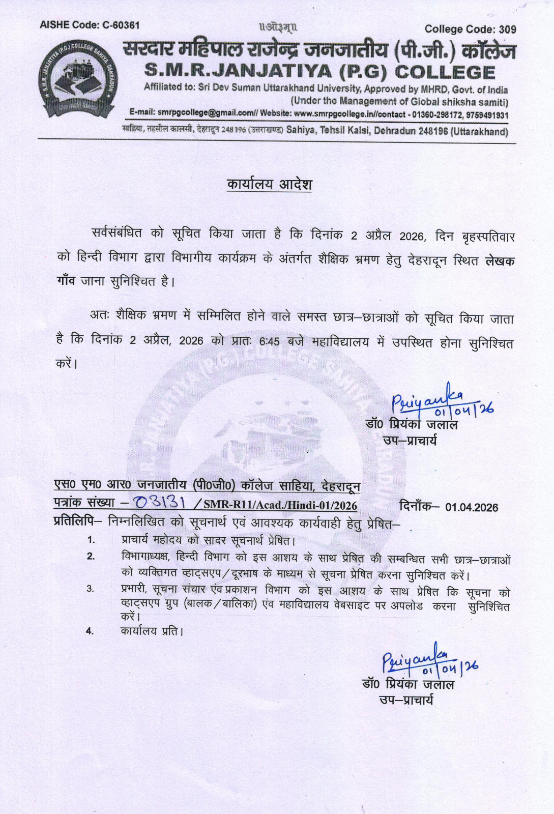 हिंदी विभाग द्वारा आयोजित शैक्षणिक भ्रमण के संबंध में सूचना